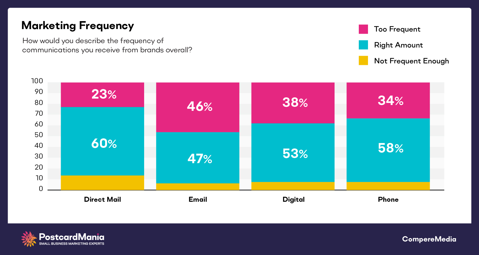 • Only 23% of respondents reported that they receive direct mail pieces too frequently, far fewer than all other channels, including email (46%), digital ads (38%), and phone calls (34%). Additionally, 16% of respondents report that they don’t receive enough direct mail. CompereMedia (2024)