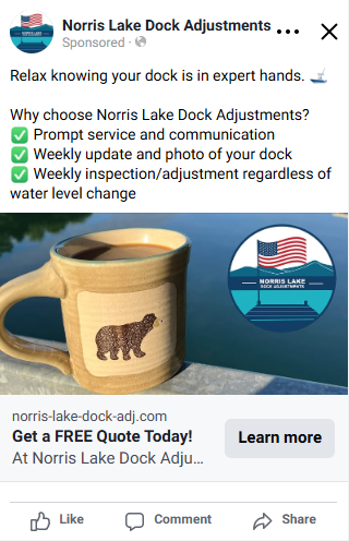 Norris Lake Dock Adjustments signed up for an Everywhere Small Business campaign that combined both postcards and online ads. They mailed 2,000 postcards and ran ads on Google, Facebook, and Instagram at the same time. They provided their own list of contacts for the mailings, but the online ads targeted a similar audience to generate more leads.