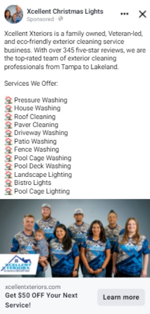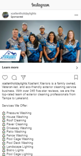 Xcellent Xteriors is a family-owned, veteran-led exterior cleaning service business that is based in Lakeland, FL. The owner and operator, Ryan Edrington, served in the Marine Corps and started his business in 2012, mainly hiring veterans in the community. Their services include landscape lighting, house washing, roof cleaning, Christmas light installation, and pressure washing.