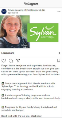 Sylvan Learning of East Brunswick signed up for an Everywhere Small Business campaign that combined postcards with digital ads. They mailed a total of 12,000 postcards to their own list of contacts. Then the digital ads appeared in the feeds of their prospects after the mailings, which were broken up in half and sent out over 2 months in May and July.