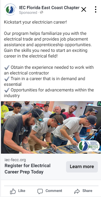The Independent Electrical Contractors (IEC) of the Florida East Coast provides apprentices, journeymen and management with education, training, and forums in the electrical construction industry. Located in the Palm Beach Gardens, FL area, they wanted to sign up more people for their educational programs and generate more revenue, so they reached out to PostcardMania for help.