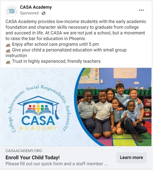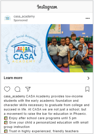 CASA Academy, located in Phoenix, AZ, offers high-quality education to children grades K-5th Grade. They needed to let the community know about their tuition-free school and educational opportunities, so they came to PostcardMania for marketing assistance.
