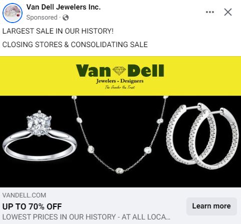 Van Dell Jewelers was a jewelry company based in Royal Palm Beach, FL. They were closing their stores, so they decided to announce it by mailing postcards to local residents.
