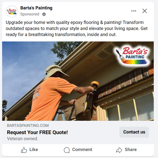 Barta’s Painting signed up for an Everywhere Small Business Platinum Plus Campaign which is the deluxe level of marketing at PostcardMania. This package includes a custom mailer designed by professional copywriters and graphic designers, matching digital ads on Facebook, Instagram and Google, as well as video ads on Youtube and Connected TV channels like Netflix and Roku.