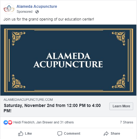 Both owners of Alameda Acupuncture thought the campaign was very successful and said that they loved the design! They had 100 people show up to the grand opening of their education center. Five individuals that attended came as a result of the postcards mailed out, and others came because they saw advertisements on Facebook. Because of the event, the practice has gained six new patients and even reactivated some old patients as well! A representative of the practice said that each new patient is $2,500, and she believes that they have made about $15,000 from the first mailing so far. They have more people wanting to sign up, so there is more to come!