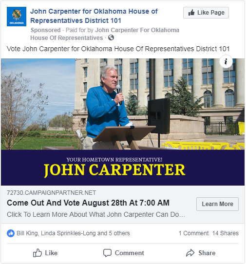 John won the election! The internet ads were a huge key to his success in combination with his direct mail campaign! Between Facebook and Google over 59.000 people saw his ads and 126 people clicked through to his website!