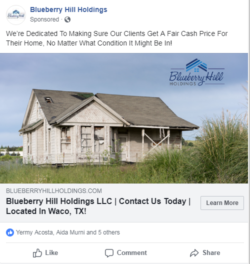 Blueberry Hill Holdings purchased a mailing list of single family homeowners that were 30+ days late on their mortgage. They also purchased a mailing list of non-owner residents.