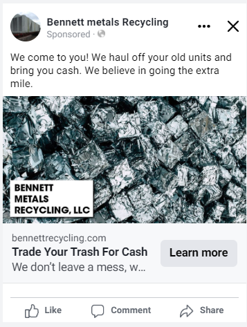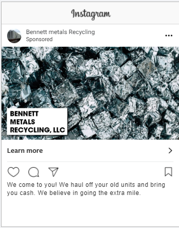 This is Bennett Metals Recycling’s first campaign with PostcardMania and is looking forward to even greater results in the future since the digital ads through their Everywhere Small Business campaign are still active.