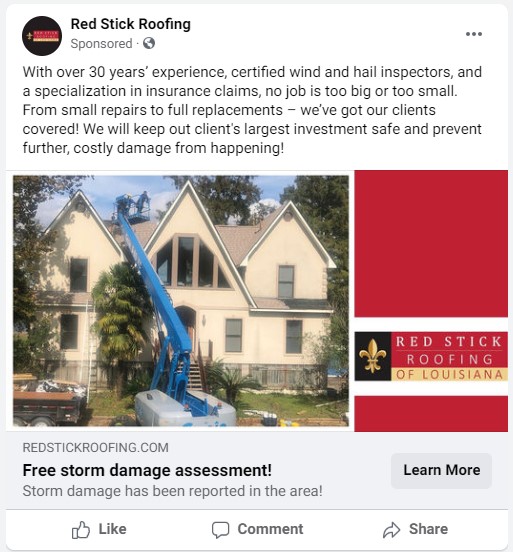 Red Stick Roofing had about 20 responses from their first campaign and converted 7 of them into jobs! On average, full roof replacements cost $10,000 so their estimated income generated was $70,000!