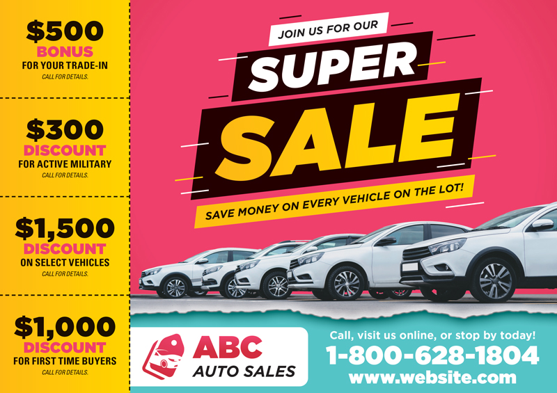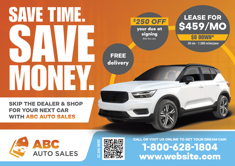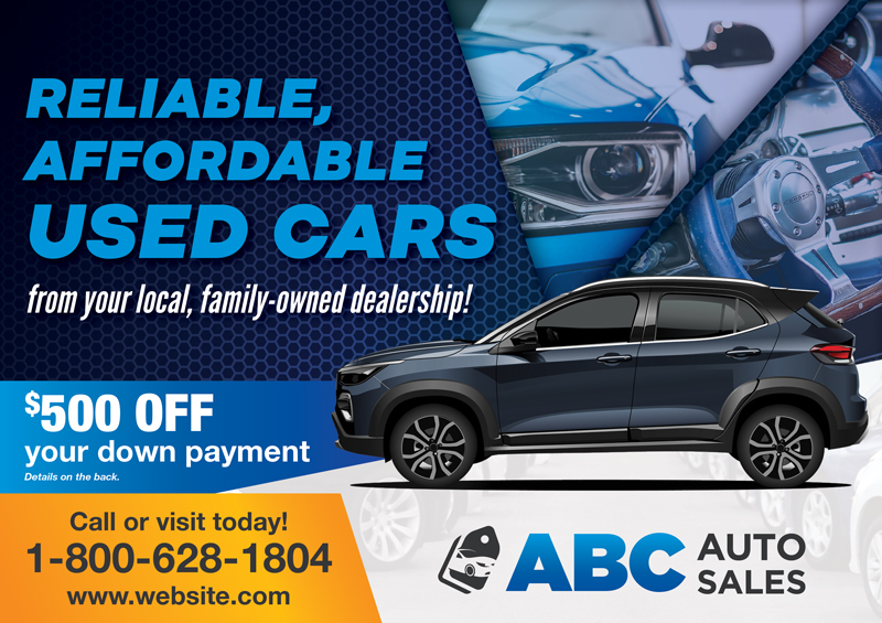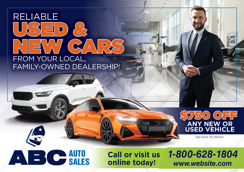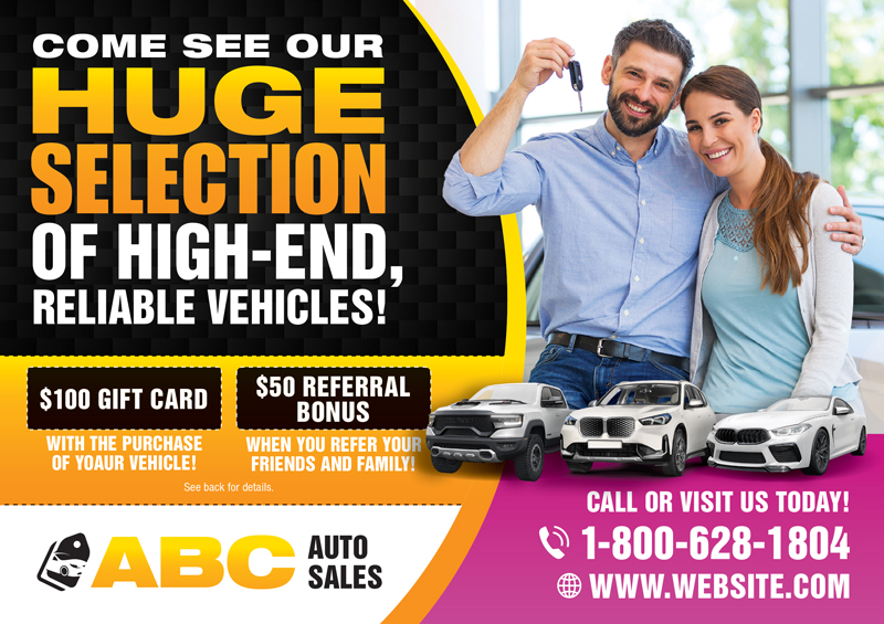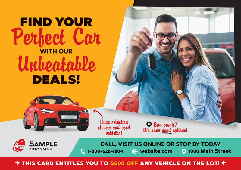 When it comes to car dealership marketing, you need to have unique marketing collateral that adequately defines your company. We have worked with hundreds of car lots, dealerships, and auto sales professionals and know what works to bring in leads and revenue. We have car dealership advertising ideas as well as car dealership marketing plans that deliver real results. You can select a car dealership template postcard and customize it with your logo and contact information or contact us for a one-of-a-kind auto dealer postcard design. All you have to do is scroll through the samples and select one that fits your style and needs best. We also have additional car dealership marketing advice that you can use for your auto business on our website.