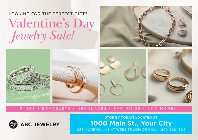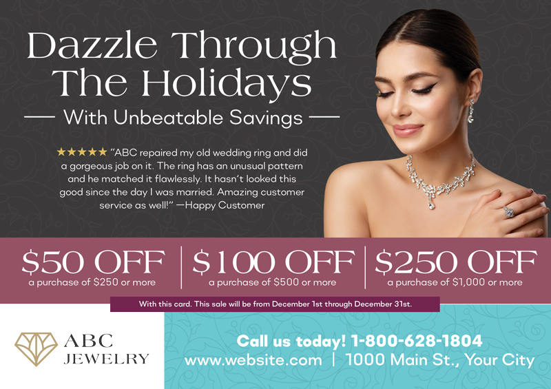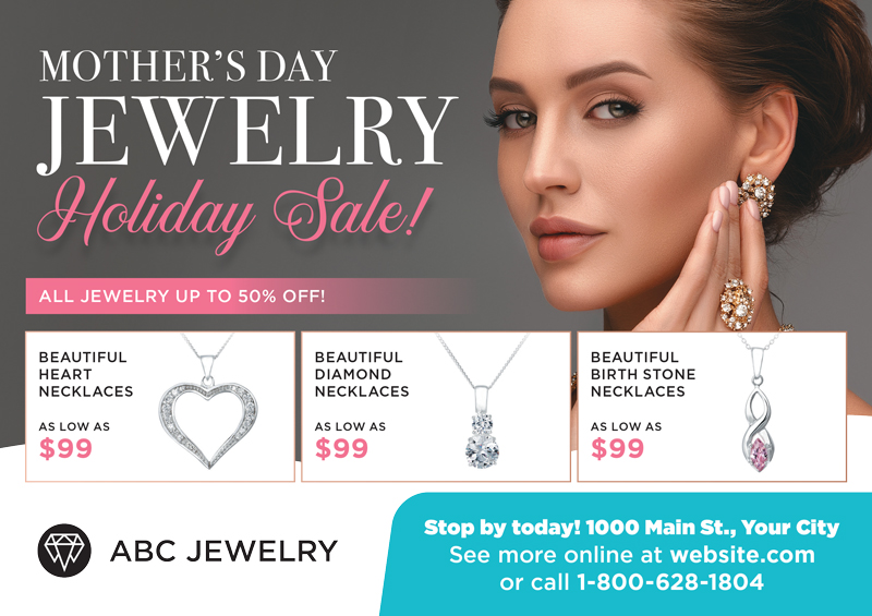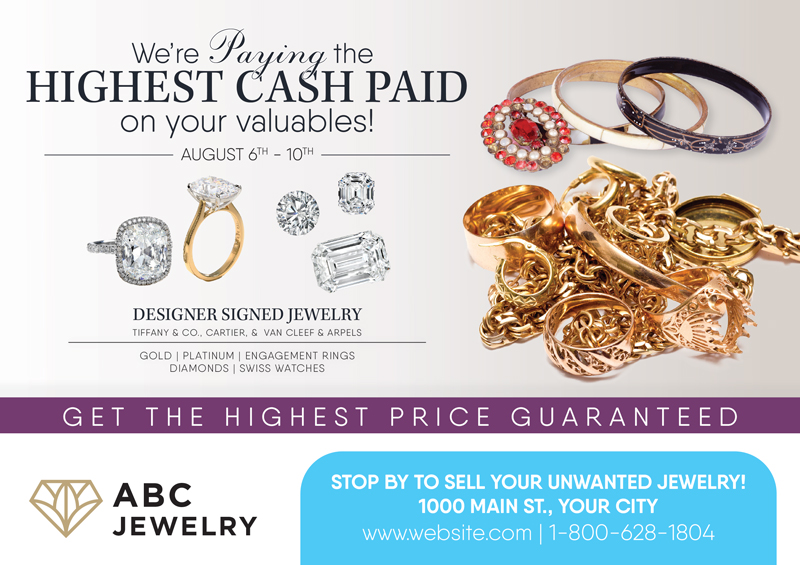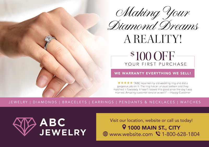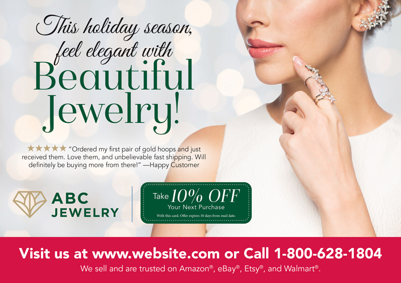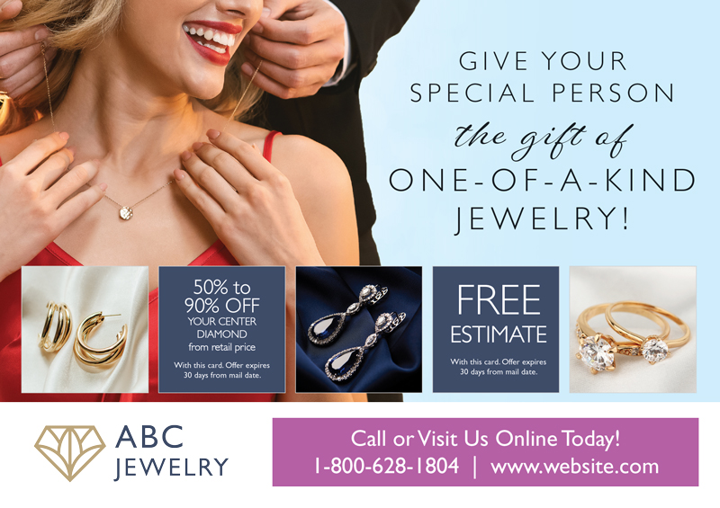 You deserve jewelry marketing that’s as effective as your products are gorgeous. We’ve worked with hundreds of jewelers and jewelry professionals, and we’ve tracked the data from all the jewelry ads that work including marketing jewelry online. Above you’ll see examples of direct mail postcards and marketing ideas for jewelry business. These are actual postcards our clients have used with spectacular results. Easily get jewelry advertisement ideas from any of our designs you see above… or, better yet — we can customize any of our designs with your store’s logo. If you prefer, we can even design you a fresh NEW postcard from scratch. Simply scan through our gallery, and don’t forget to grab your FREE samples of our jewelry marketing postcards delivered directly to you… just enter your email below!