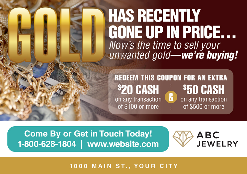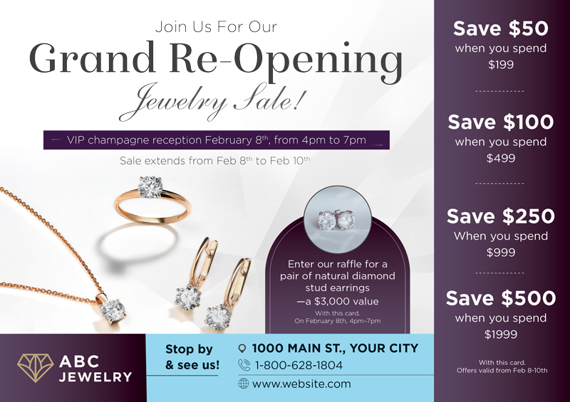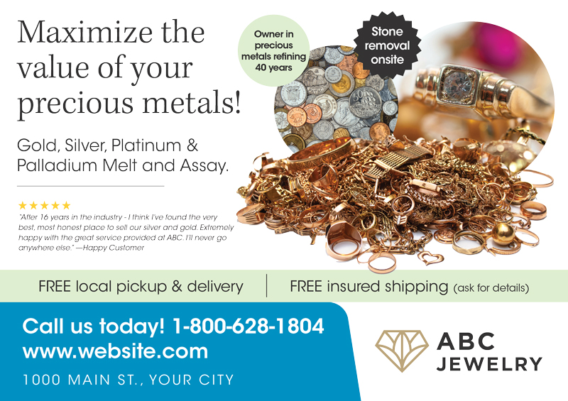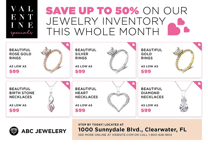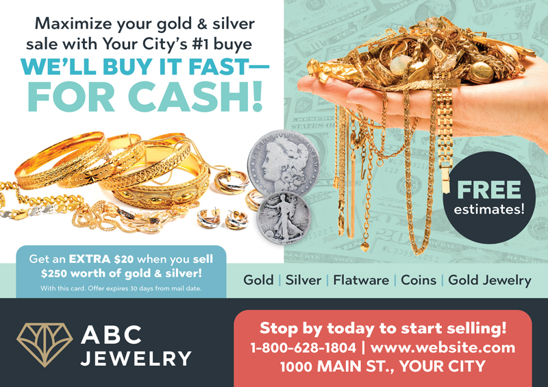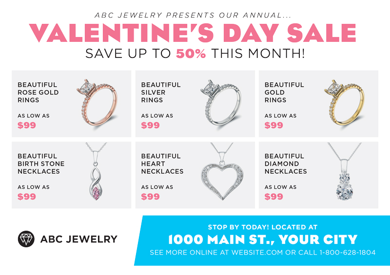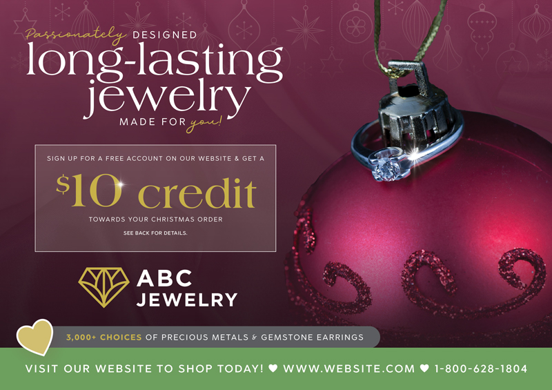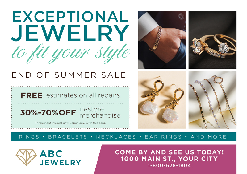 You deserve jewelry marketing that’s as effective as your products are gorgeous. We’ve worked with hundreds of jewelers and jewelry professionals, and we’ve tracked the data from all the jewelry ads that work including marketing jewelry online. Above you’ll see examples of direct mail postcards and marketing ideas for jewelry business. These are actual postcards our clients have used with spectacular results. Easily get jewelry advertisement ideas from any of our designs you see above… or, better yet — we can customize any of our designs with your store’s logo. If you prefer, we can even design you a fresh NEW postcard from scratch. Simply scan through our gallery, and don’t forget to grab your FREE samples of our jewelry marketing postcards delivered directly to you… just enter your email below!