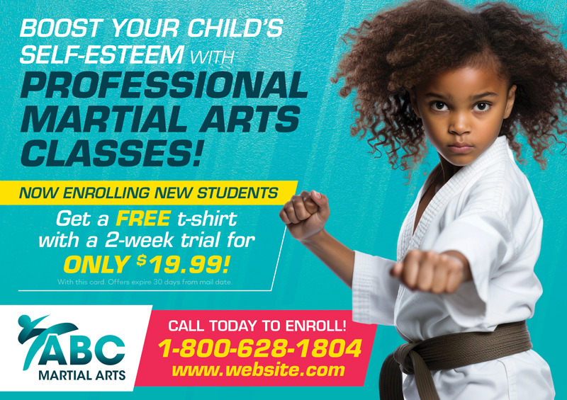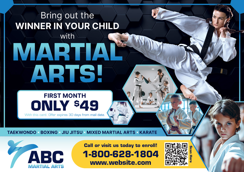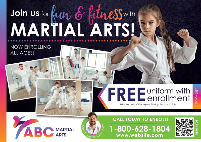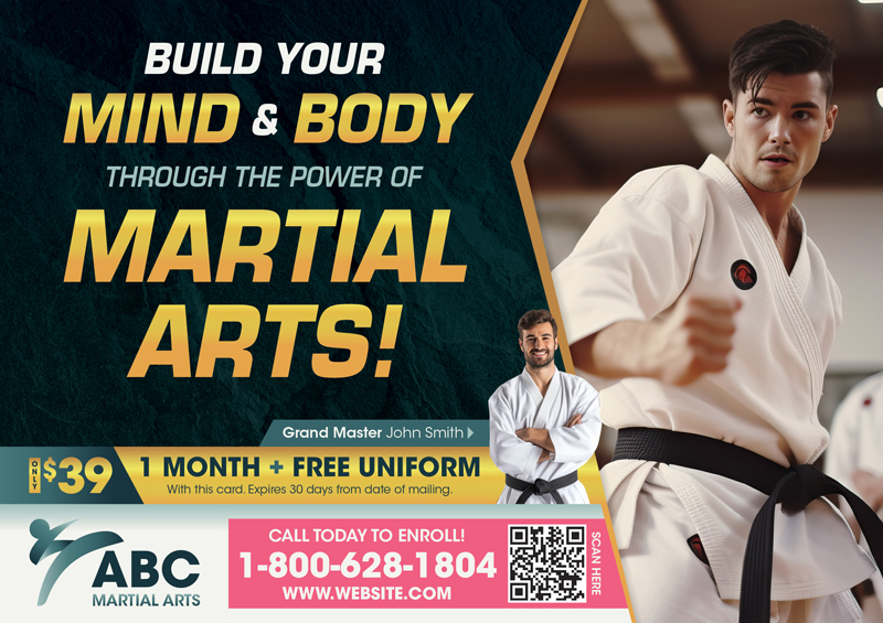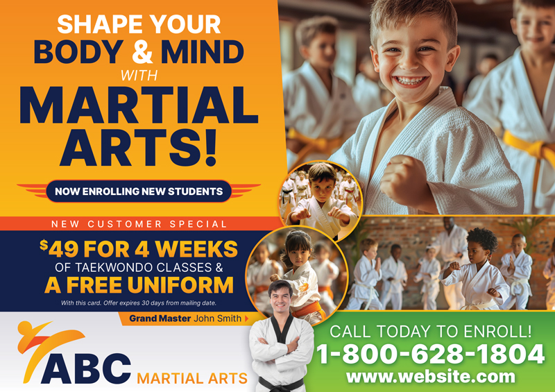 PostcardMania offers postcard designs and other marketing services for martial arts many other companies don’t have. When it comes to direct mail marketing, PostcardMania offers both martial arts template postcards and martial arts custom designs. These martial arts mailers will help grab the attention of potential clients and also increase your annual revenue.