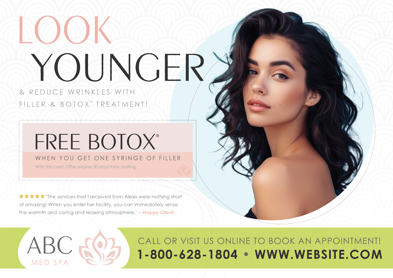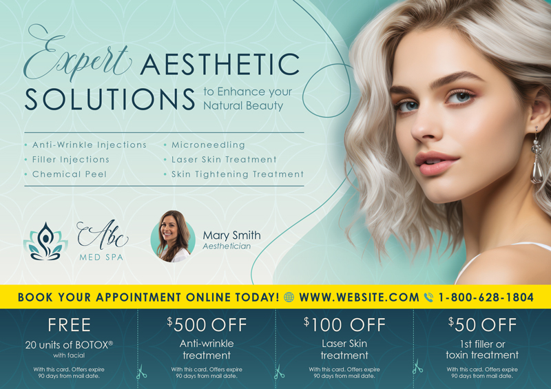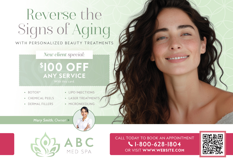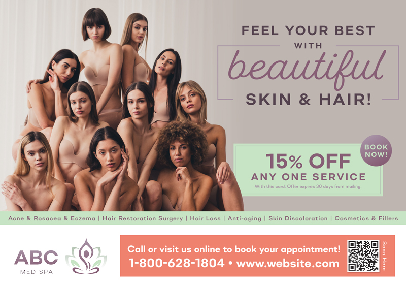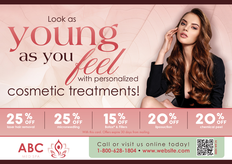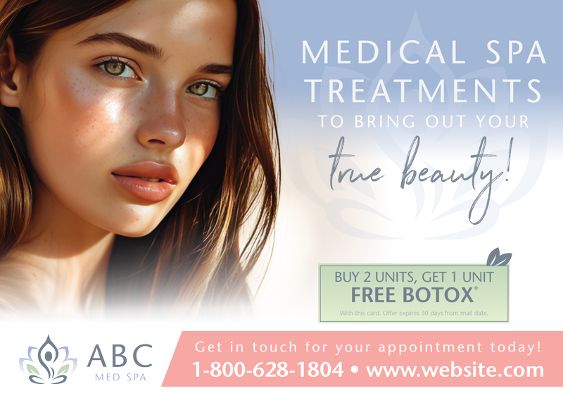 We have created many spa promotions and worked with hundreds of spas and salon professionals over the years, and we have tracked the data from all of those spa marketing campaigns. So we know how to get results for you using med spa marketing. Above you’ll find examples of the spa advertising cards our actual clients have used with spectacular results. You can use any design you see for your own business and customize it with your logo for your spa marketing plans. Or, if you prefer, we can design you a brand-new spa marketing postcard from scratch. Simply use the arrows to scroll through the gallery, or check out these links for beauty salon promotion ideas, med spa postcards, salon spa postcards and tanning spa postcards!