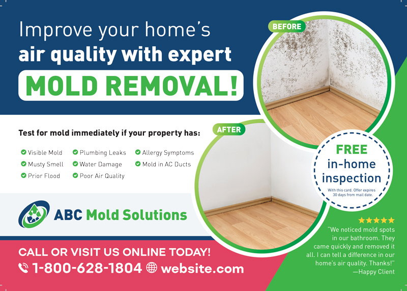 On this page, you’ll find mold remediation advertising ideas and many postcard designs that you can use in your next direct mail marketing campaign. Every mold removal postcard can be customized to your own business. We hope that these templates and design ideas will help you on your path to growing your mold removal business.