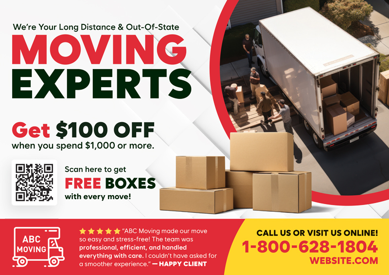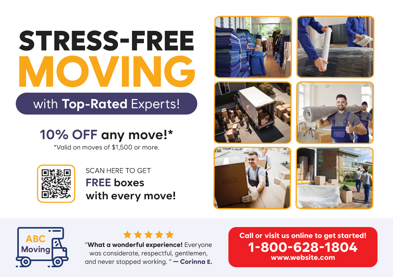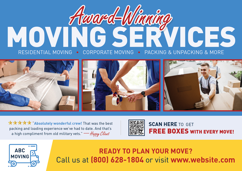 On this page, you’ll find moving company marketing ideas and examples of moving company postcards that our clients have used and achieved amazing results. You can use any sample moving company design you see. Or, we can always have our professional graphic designers and copywriters to create a custom mover marketing postcard for you.