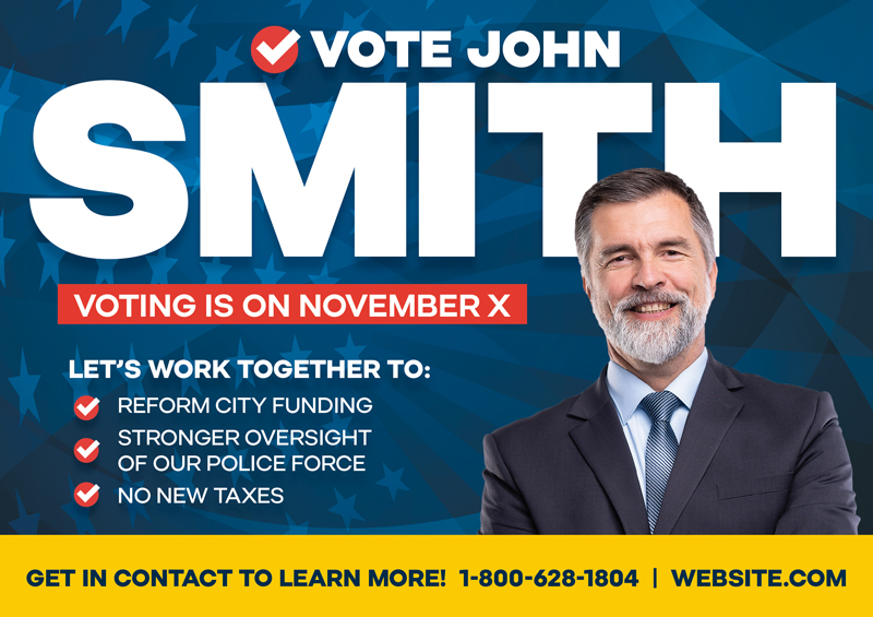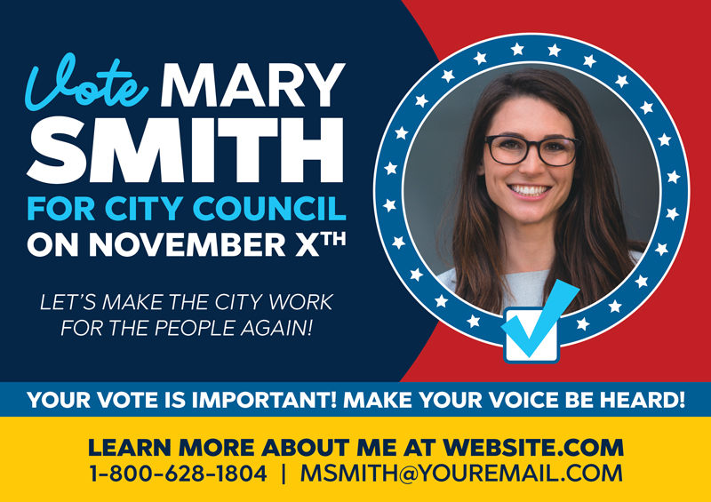 The first step is browsing our political postcard templates and getting some ideas for your political marketing plan. We can also design custom mailers tailored to your own unique needs.