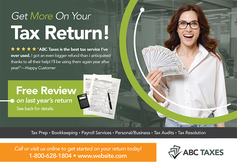 Advertising tax services is important for growing a tax business, but it needs to be done right. Tax marketing requires planning and strategy. On this page you’ll find tax preparation postcards that are proven to work. We’ve helped thousands of tax offices with their marketing. You can use any of these tax season postcard templates, or we can create a custom tax postcard design from scratch. At PostcardMania, we not only do tax advertising postcards, we also offer tax preparer advertising ideas and full-service marketing for tax professionals. If you are a tax accountant or tax preparer looking for marketing strategies, you are on the right track! Just call us to get started!