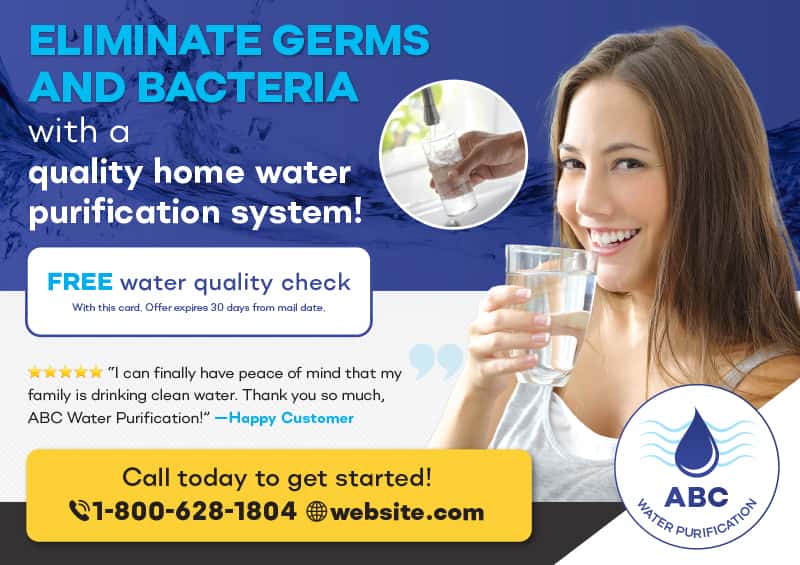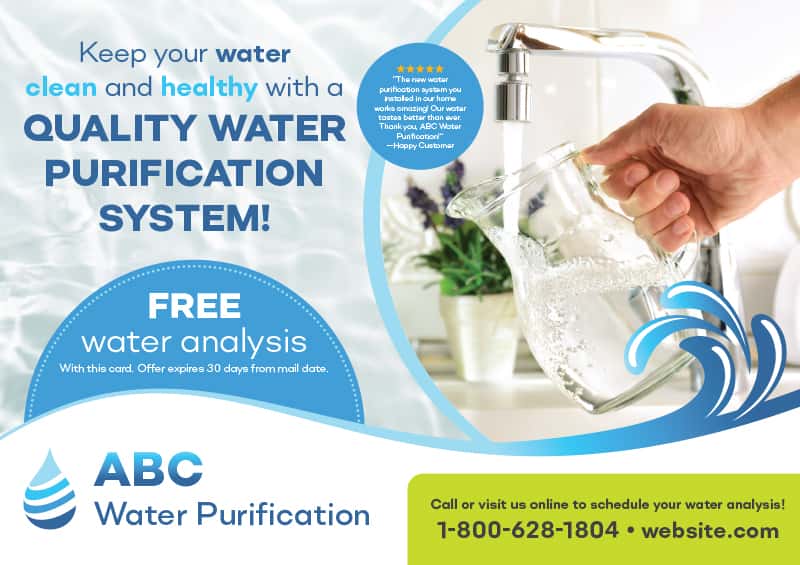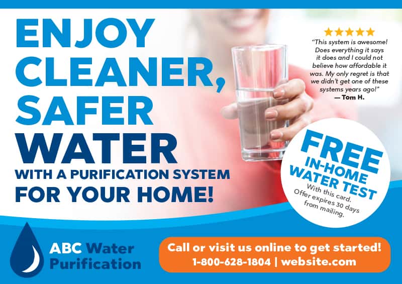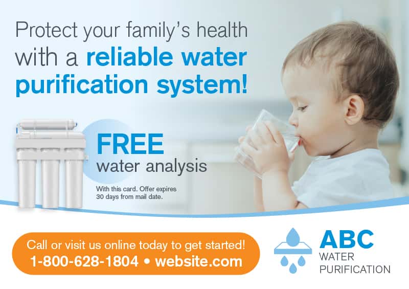 The water purification mailers above are already proven to create leads, and they’ve been used by our very own clients! You can browse our selection of sample water purification postcards for ideas or pick one and our marketing professionals will update it with your own business information, logo, and other essential details.