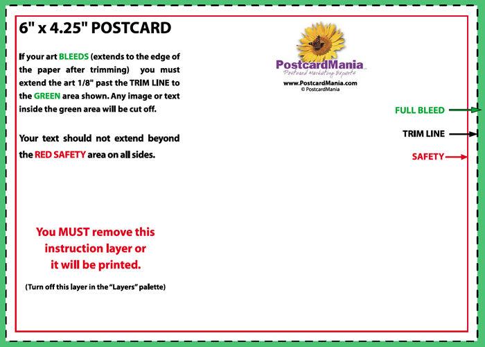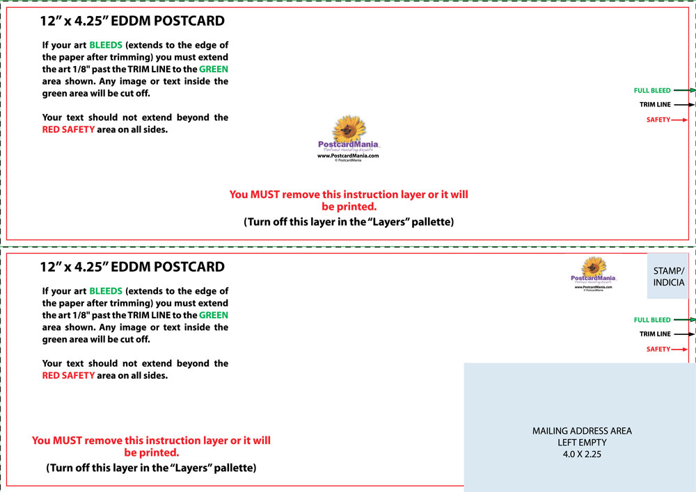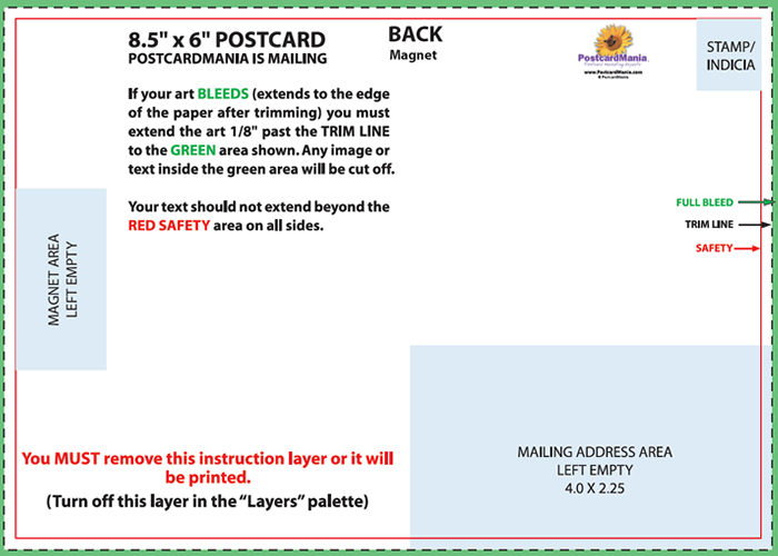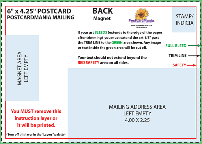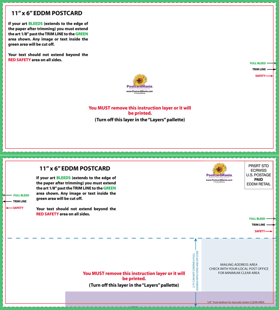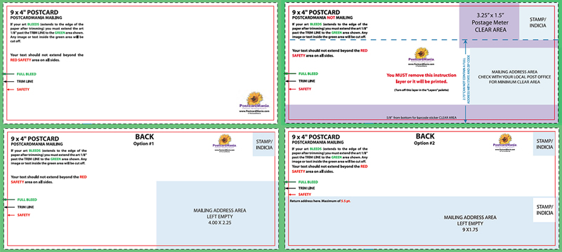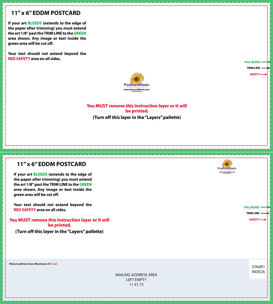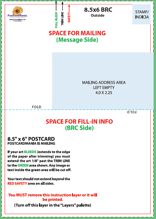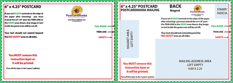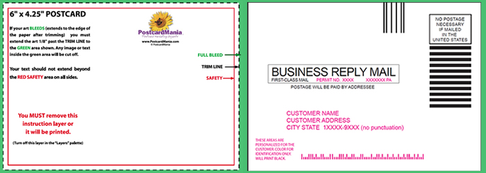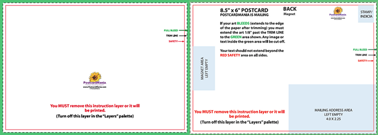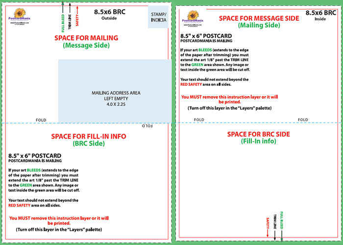 These postcard mailing templates (available for 11"x6", 8.5"x6" and 6"x4.25") include layout guides for front and back, including the mailing address area format. These templates are set up to accommodate the personalization options available with digital printing.