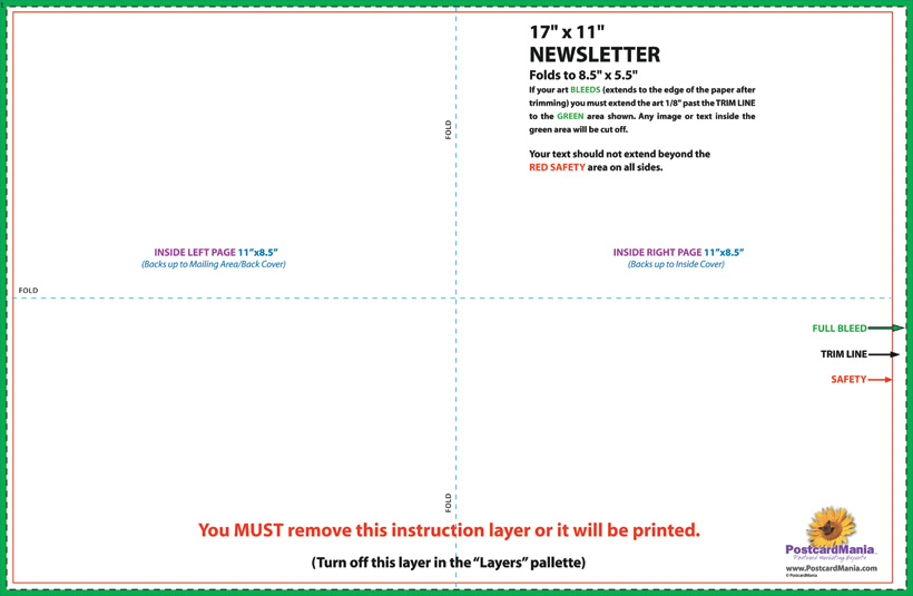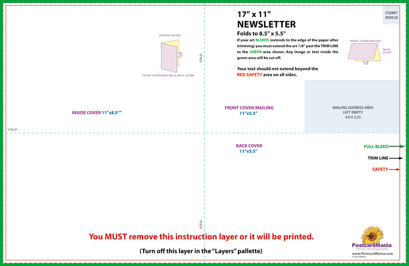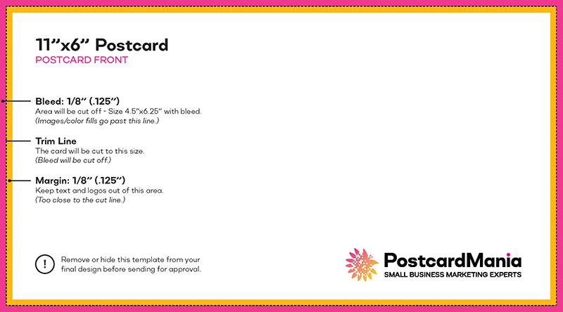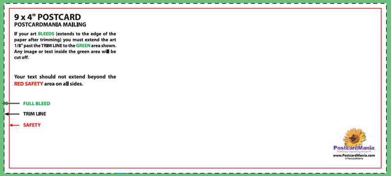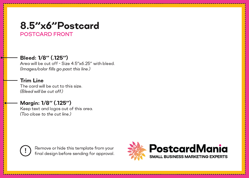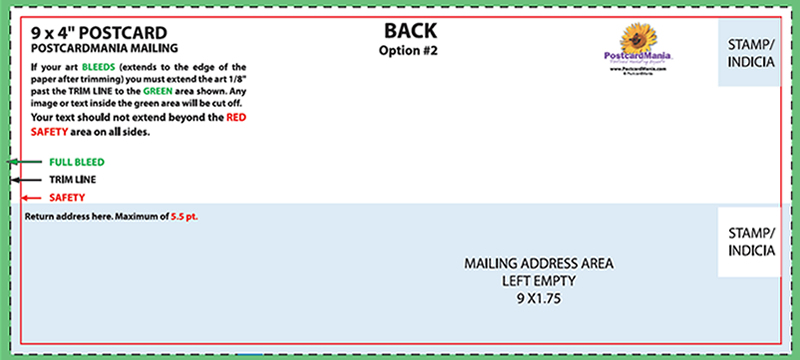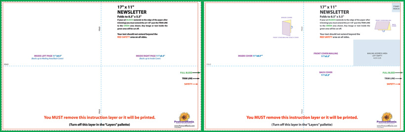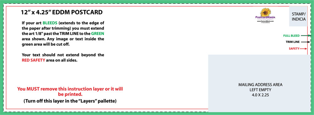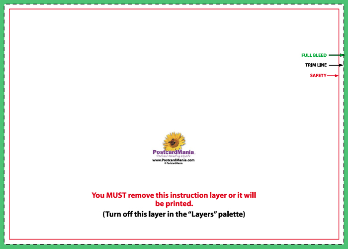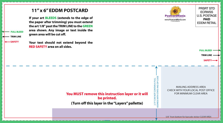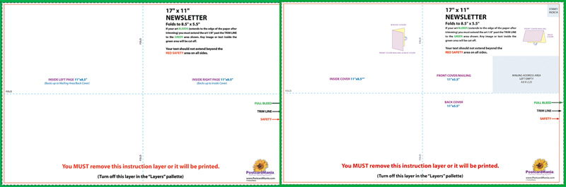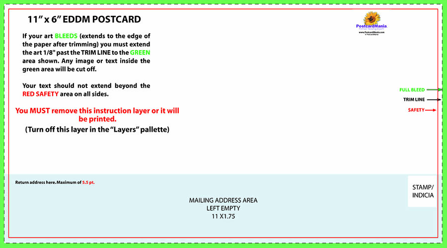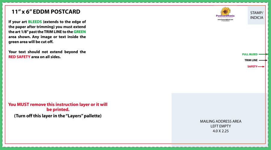 These postcard mailing templates (available for 11"x6", 8.5"x6" and 6"x4.25") include layout guides for front and back, including the mailing address area format. These templates are set up to accommodate the personalization options available with digital printing.