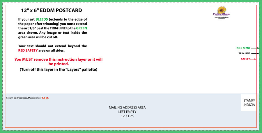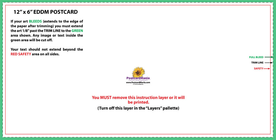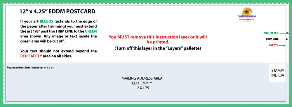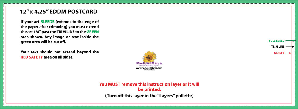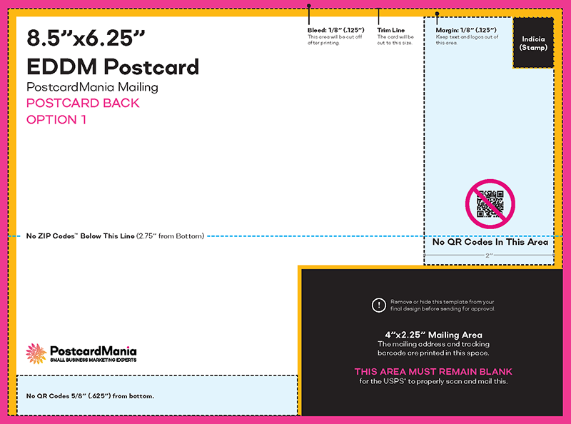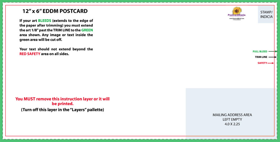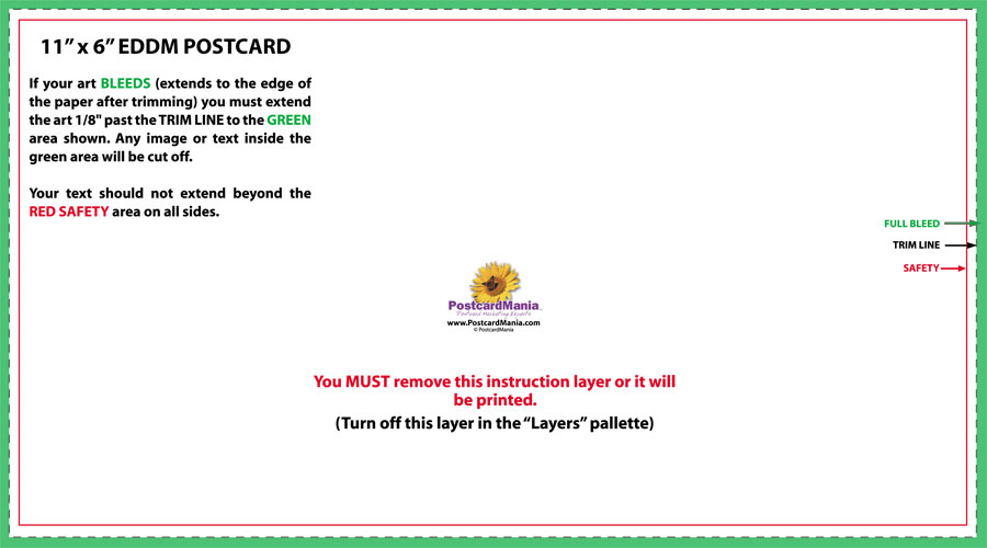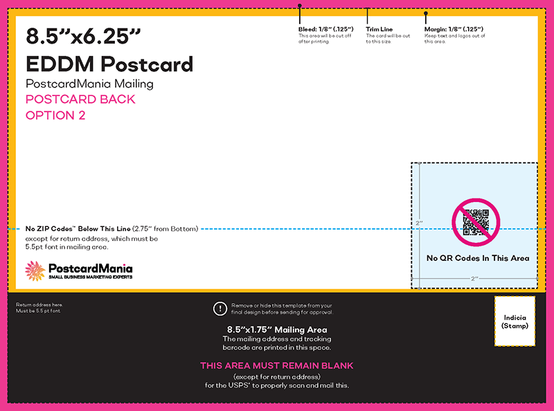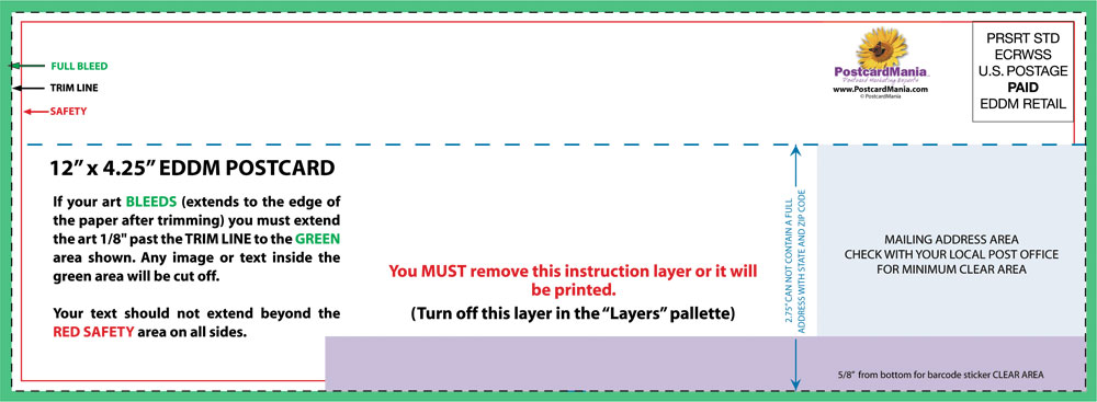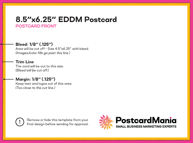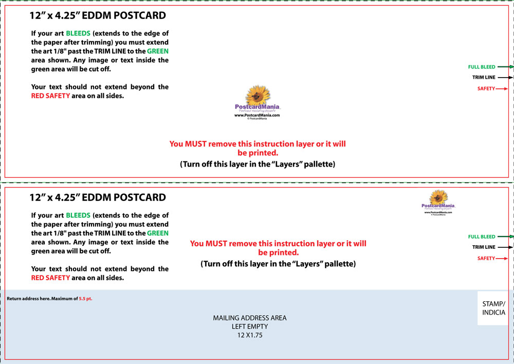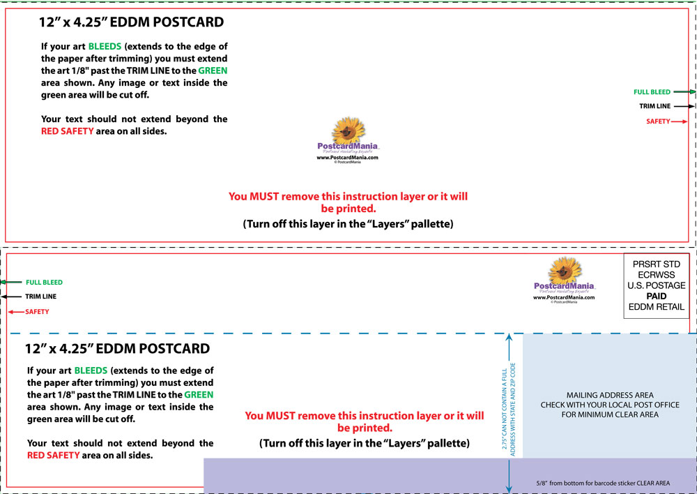 Download an EDDM template if you're planning to use Every Door Direct Mail, which blankets an entire mail carrier's route. EDDM regulations are strict — no 4x6 or 5x7 postcards are permitted — so use one of these templates to make sure you're following the rules!